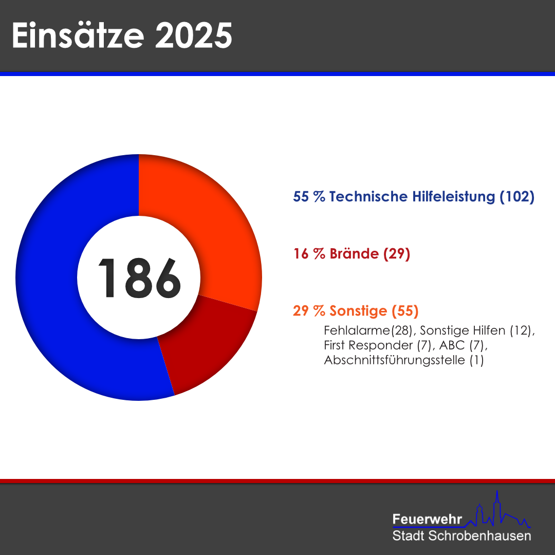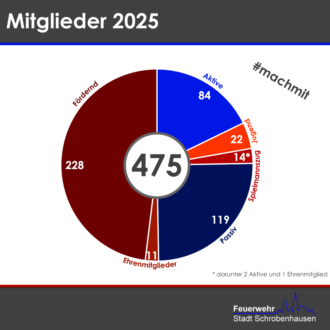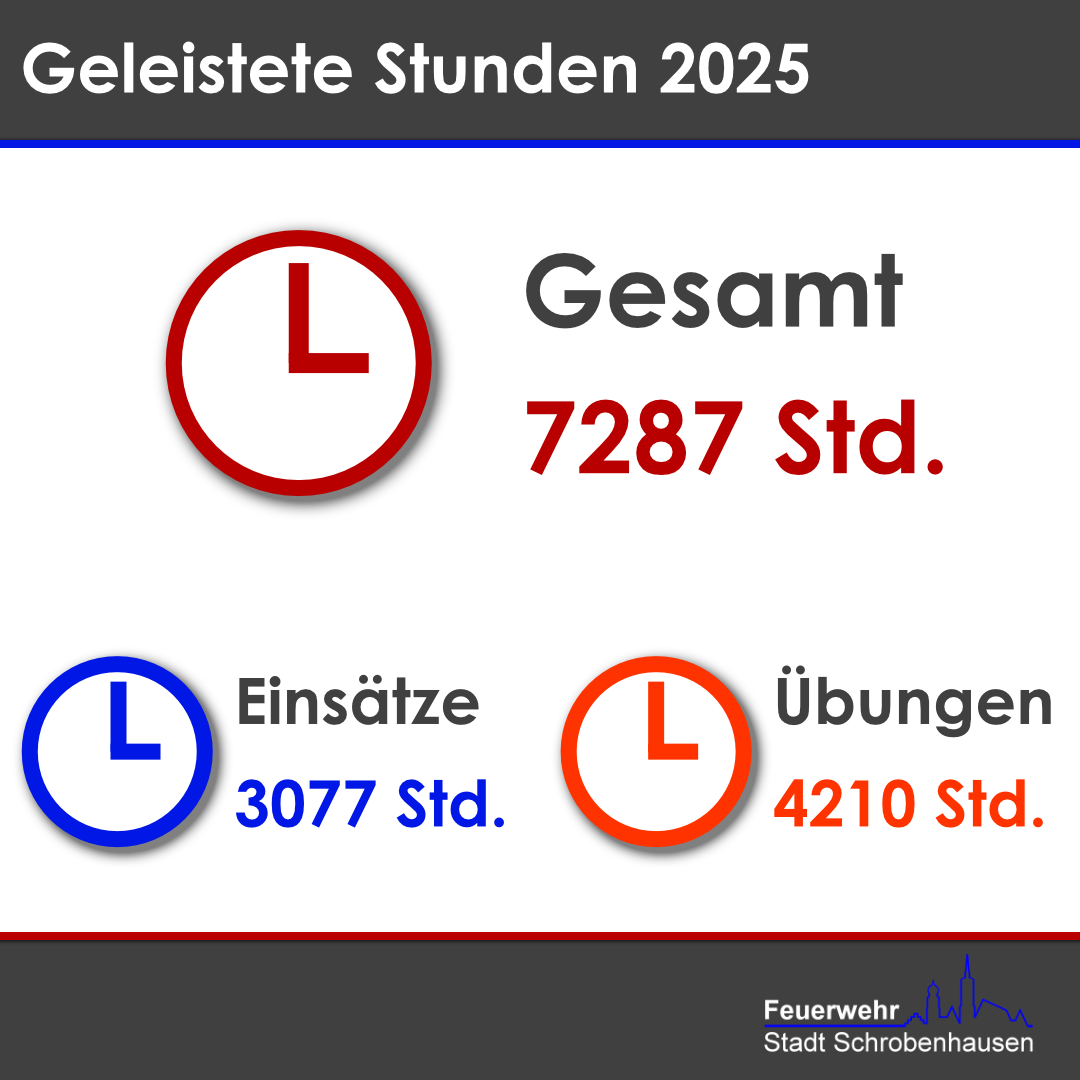 Im Rahmen unserer Jahreshauptversammlung haben wir gemeinsam auf das vergangene Jahr zurückgeblickt - ausführlicher Bericht folgt. An dieser Stelle möchten wir euch die wichtigsten Zahlen und Fakten der Feuerwehr Stadt Schrobenhausen für das Jahr 2025 vorstellen: