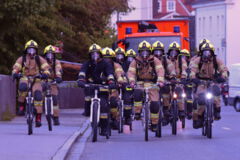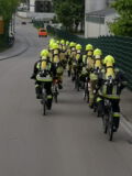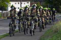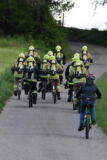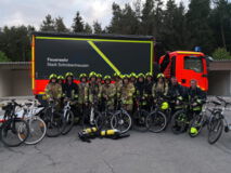 Der Regen ist nur von kurzer Dauer und hat lediglich die Sättel der im Hof stehenden Räder mit Wassertropfen übersäht. Man hört Stimmengewirr und das schlagen von Spindtüren. So nach und nach kommen insgesamt 23 Feuerwehrradler aus dem Gebäude. Eine gemütliche Radtour mit 20 Schrobenhausenern und drei aus Aresing sieht anders aus. Anstatt luftige Radsachen feuerfest Feuerwehrkleidung, Sturmhaube, Helm, schwere Stiefel. Eine Atemmaske umschließt das komplette Gesicht und Sauerstoffflaschen auf dem Rücken als zusätzliche Last. Die Verständigung ist schwierig durch die Masken und bereits ohne in die Pedale zu treten beschlagen diese bereits.