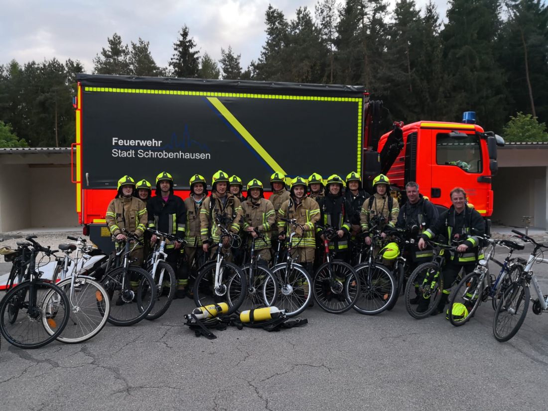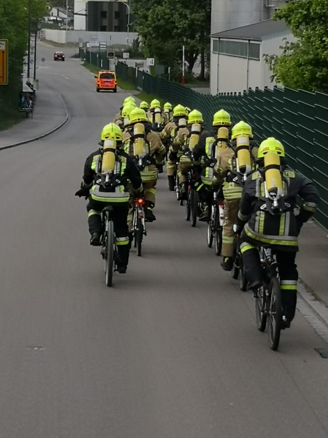 Um für den Fall der Fälle vorbereitet zu sein, ist den Ehrenamtlichen der Freiwilligen Feuerwehr Schrobenhausen (fast) nichts zu schwer. In voller Montur und mit mächtigen Sauerstoffflaschen auf dem Rücken unternahmen sie jetzt eine Radltour zu Trainingszwecken. Gemütlich ist anders. Im flotten Tempo machten sich 23 Mann auf den Weg, bis der Sauerstoff allmählich knapp wurde. Am Ende waren alle pitschnass, aber auch stolz, die Herausforderung gemeistert zu haben. Nur einer war nicht ganz so kaputt wie die anderen. Dem Hörensagen nach soll er - natürlich versehentlich - ein E-Bike erwischt haben.