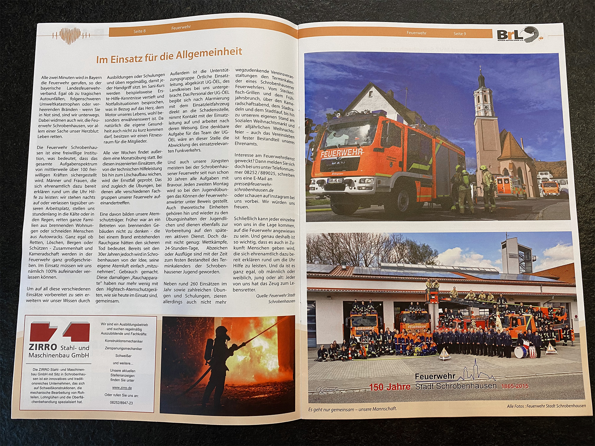 Wusstet ihr das alle zwei Minuten in Bayern die Feuerwehrgerufen wird? Kennt ihr unsere Aufgaben und Fachgruppen? Habt sogar selber Interesse ein Mitglied unserer Feuerwehr zu werden? All das über eure Stadtwehr könnt ihr in dieser Zeitschrift auf Seite 8 in einem kleinen Überblick erfahren.