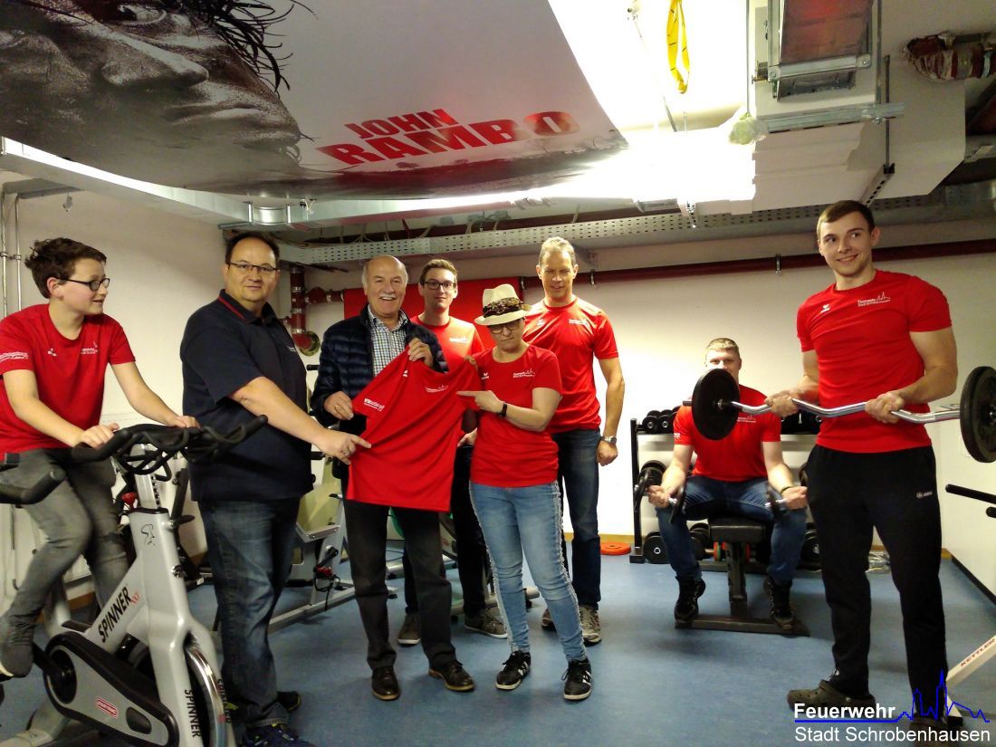 Um das Trainingsziel zu erreichen benötigen die Feuerwehrler natürlich auch die richtige Ausrüstung und so konnten Dank der Unterstützung der Raiffeisenbank Schrobenhausener Land eG für alle Trainingsteilnehmer rote Sport T-Shirts mit dem Logo der Stadtfeuerwehr beschafft werden.