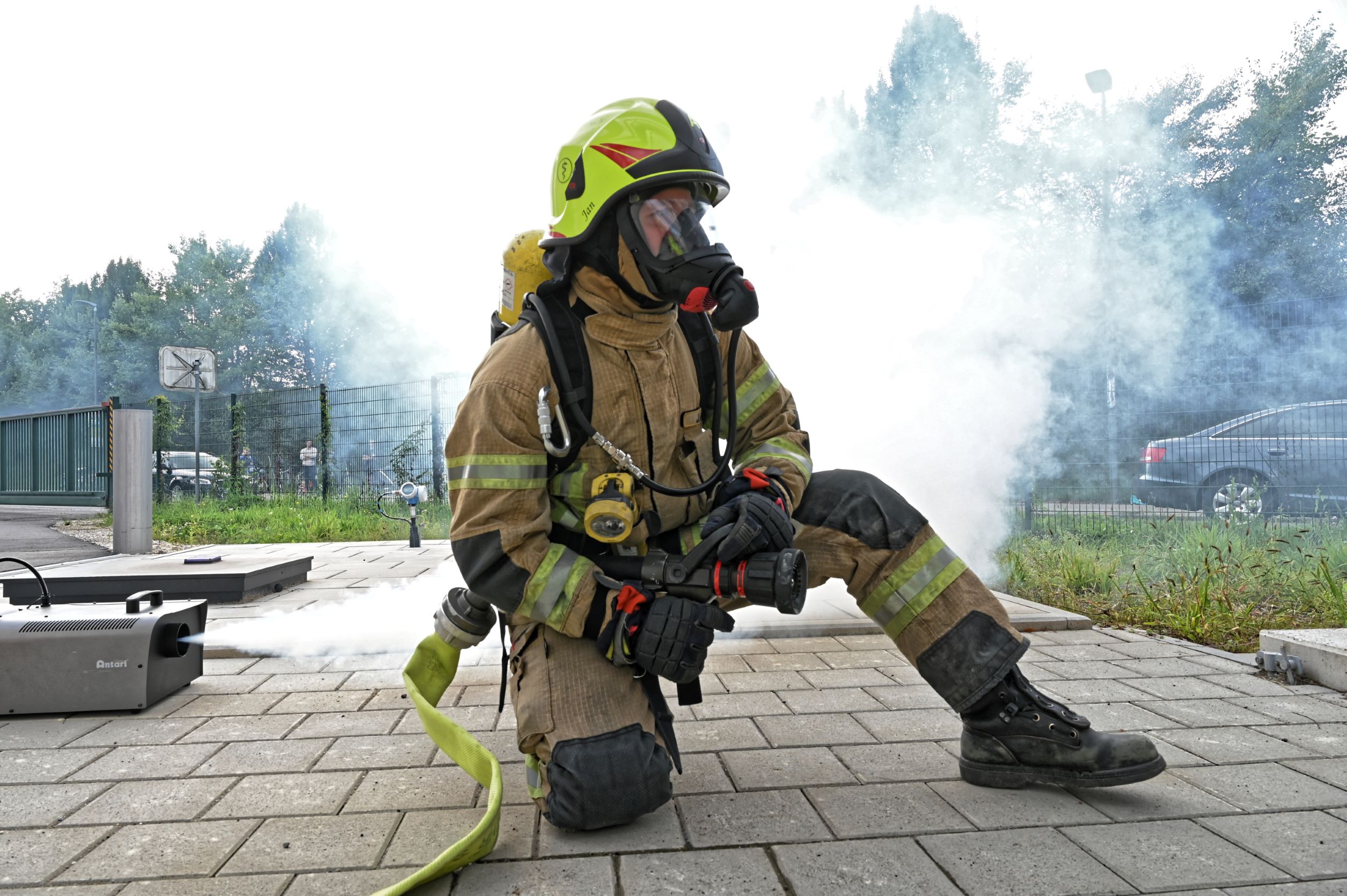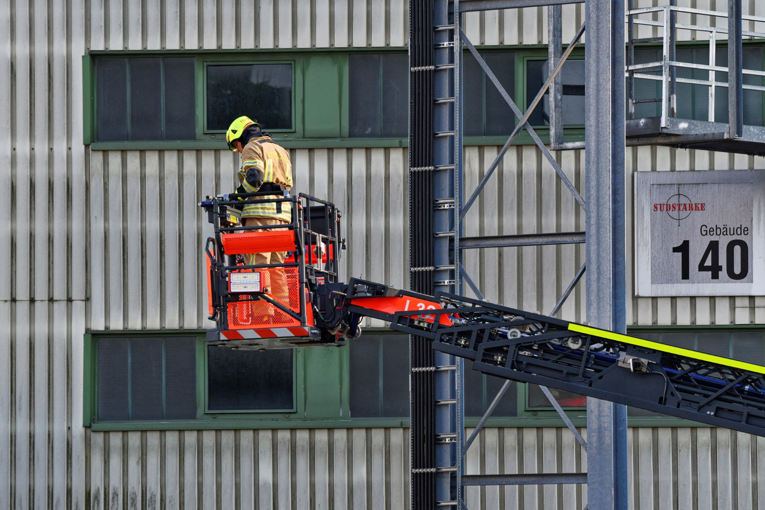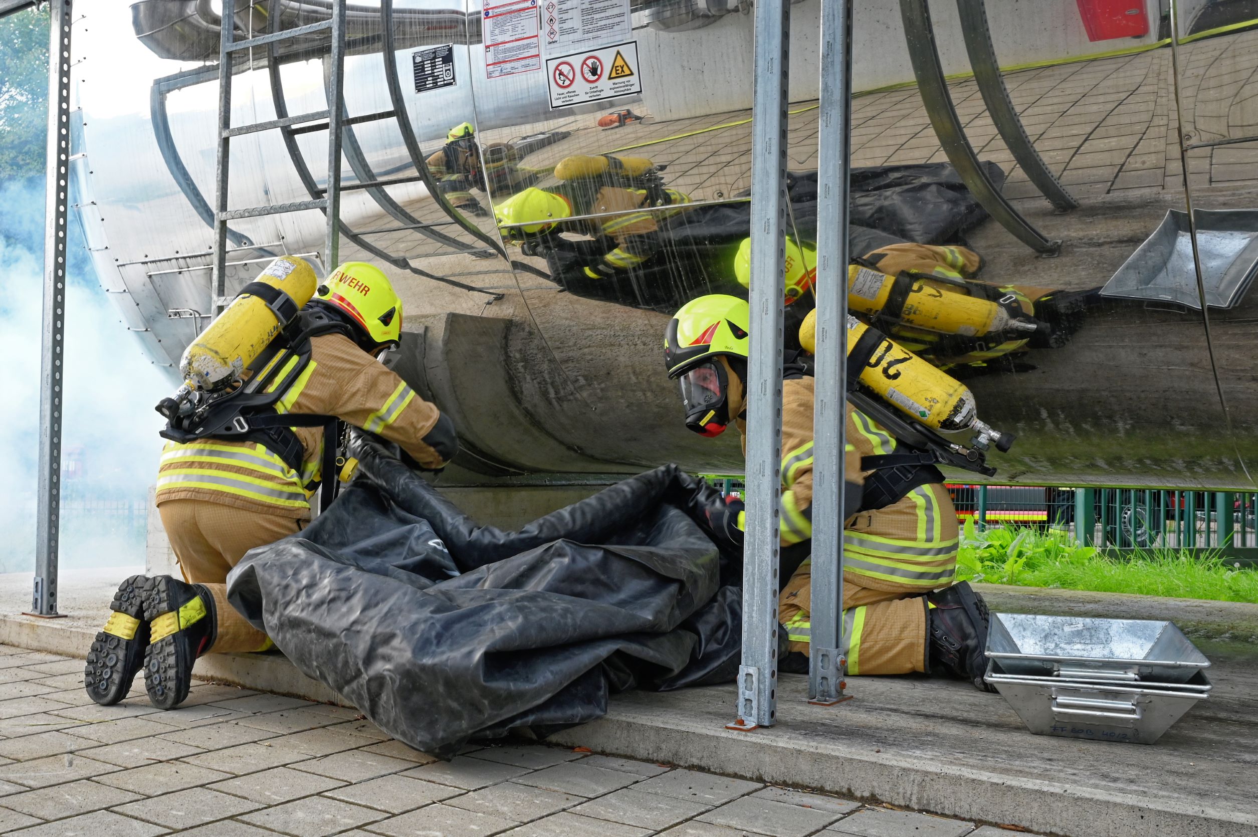 Während die Drehleiter in Stellung gebracht wurde, um die Person möglichst schnell aus dem Gefahrenbereich zu holen, begann die Besatzung unseres Tanklöschfahrzeugs 21/1 mit der Bekämpfung des Brandes und, unterstützt durch unseren Versorger 56/1, mit dem Aufbau der langen Schlauchleitung zur Wasserversorgung. Die beiden HLF‘s, sowie unser „Pulverl“ (PLF) wurden zeitgleich mit der Abdichtung der Leckage am Gefahrguttank unter CSA beauftragt und errichteten außerdem den benötigten Dekon-Platz.