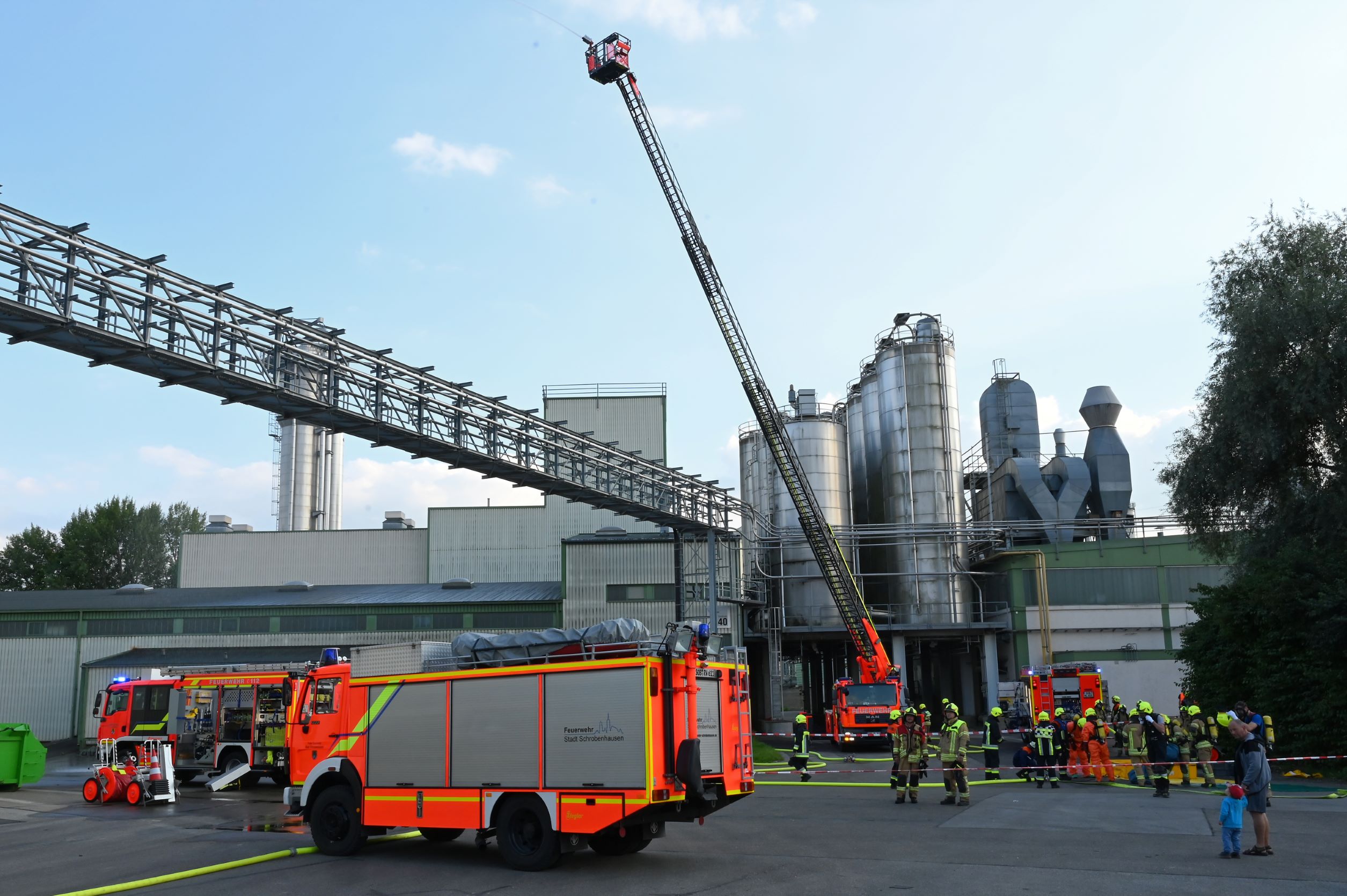 Ein Unfall auf dem Betriebsgelände! Eine Halle bei der Anlieferung welche in Brand geraten war, infolgedessen ein unbekannter Gefahrstoff aus einem leckgeschlagenen Tank austrat. Zu allem Übel konnte sich eine Person, welche sich auf einem Silo in der Nähe der Unglücksstelle befand nicht mehr rechtzeitig in Sicherheit bringen und musste gerettet werden!