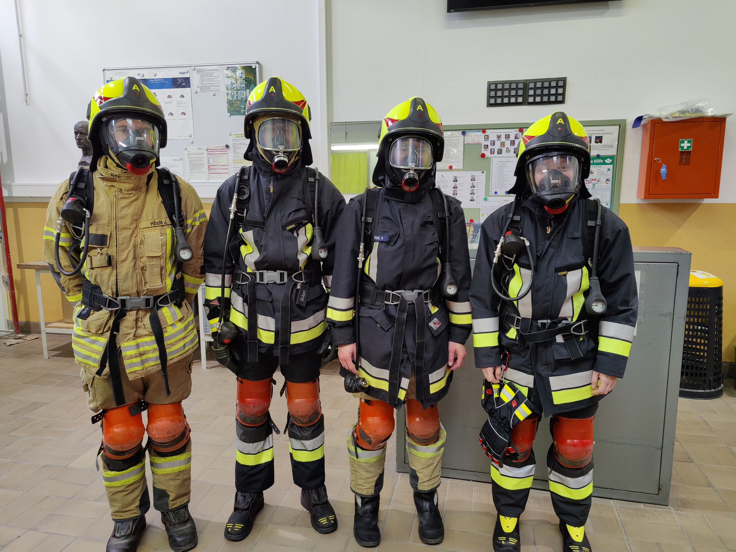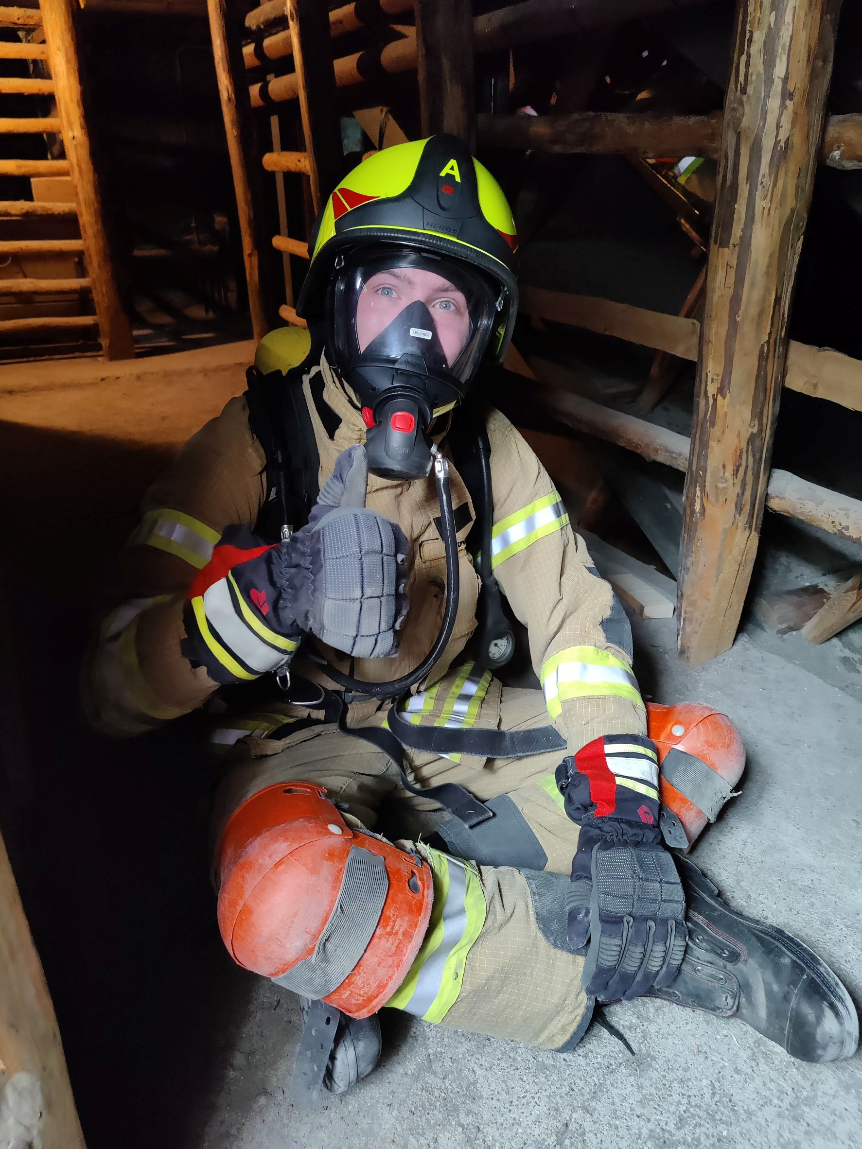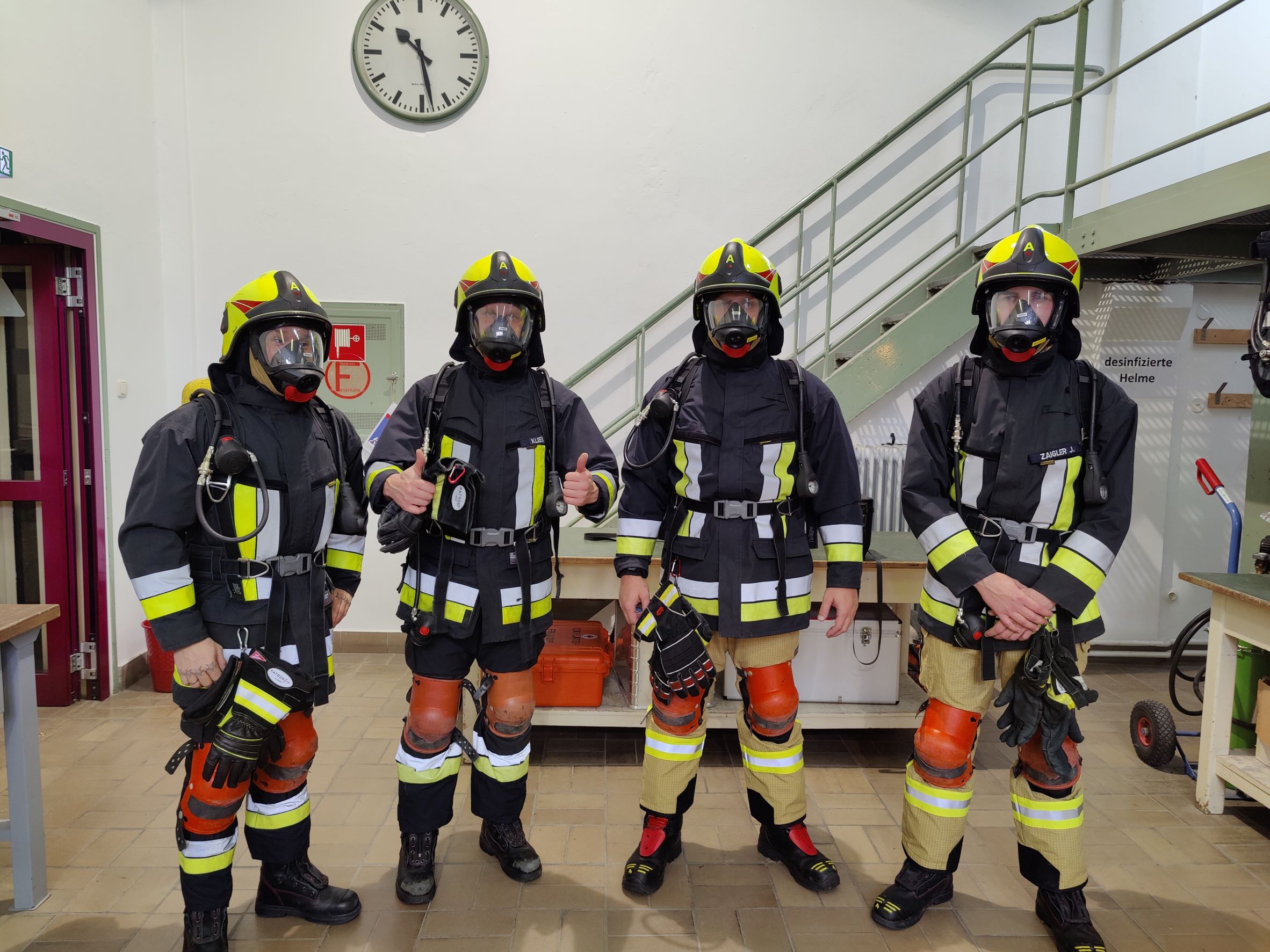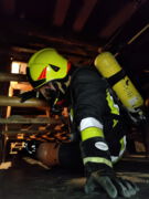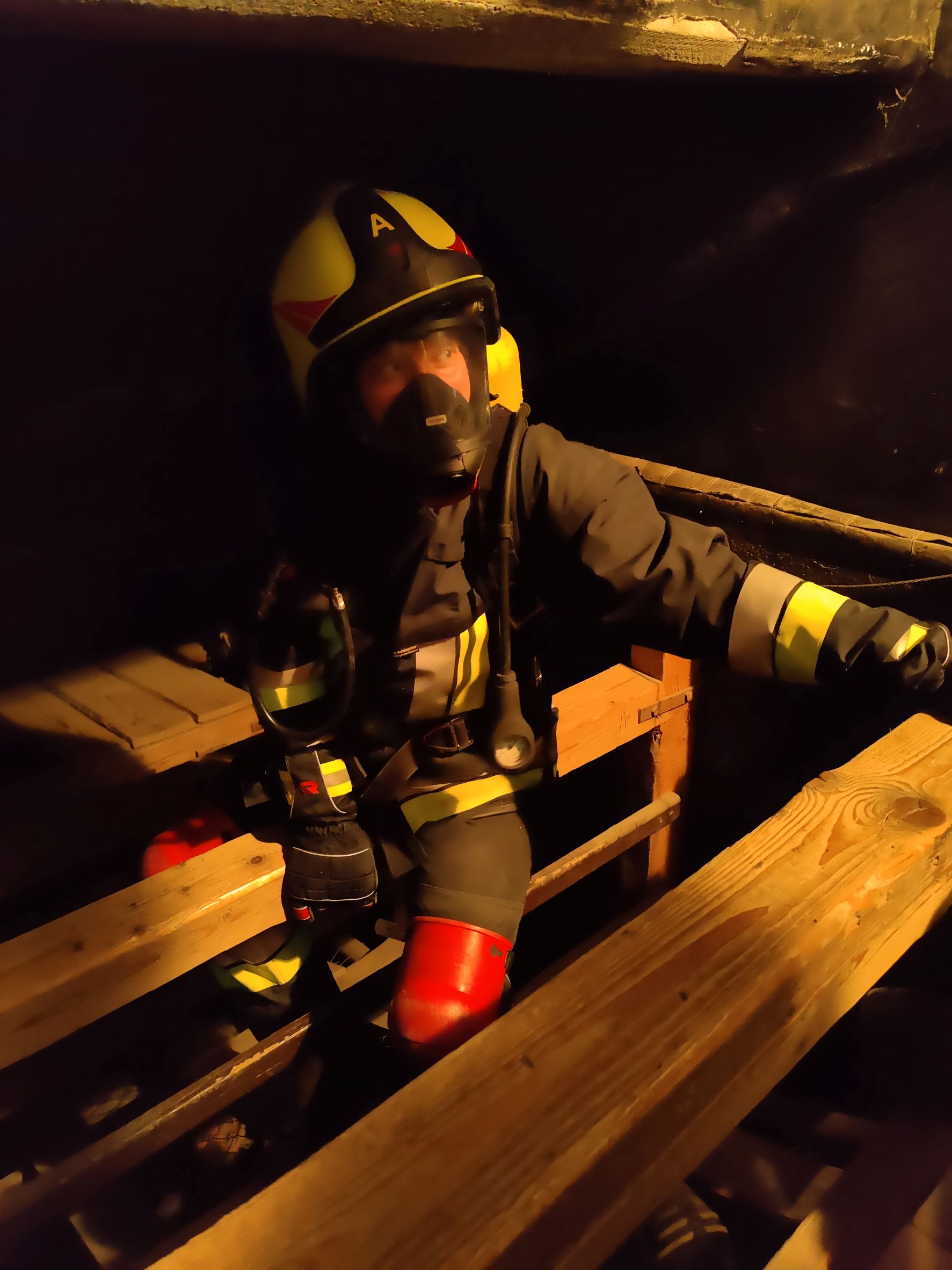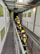 Dort angekommen rüsteten sich unsere Atemschutzträger mit Schutzkleidung, Pressluftatmern und zusätzlich auch mit Knieschonern aus. Nach kurzer Einweisung ging es dann auch schon los: Zur Aufwärmung mussten alle eine Stecke auf einem steil ansteigenden Laufband zurücklegen. Anschließend ging es auf einer Leiter nach oben zum Eingang der Übungsanlage. Darin mussten mehrere steile Schächte abwechselnd nach unten und oben bestiegen werden. Das wurde durch zahlreiche Hindernisse, wie zum Beispiel Engstellen, Röhren oder Förderketten erschwert. Dazu war neben Kraft und Geschick vor allem Teamarbeit gefordert.