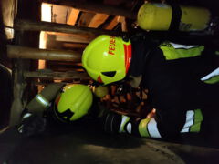 Im zweiten Abschitt der Übungsstrecke gab es dann einige lange und sehr niedrige Gänge zu durchqueren. Zum Abschluss ging es dann noch durch einen nachgebildeten Bergwerksstollen mit Schienen und Förderwägen darauf. Auch über diese mussten die Atemschutzträger noch hinüberklettern, bevor sie schließlich sichtlich erschöpft den Ausgang erreichten.