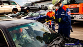 Der erste Übungseinsatz ließ nicht lange auf sich warten, Verkehrsunfall mit eingeklemmter Person. Diese galt es mit Spreizer und Schere zu befreien. Jeder musste mal ran und so konnte im Teamwork die Person schnell dem Rettungsdienst übergeben, alles natürlich unter Aufsicht erfahrener Feuerwehrdienstleistender.