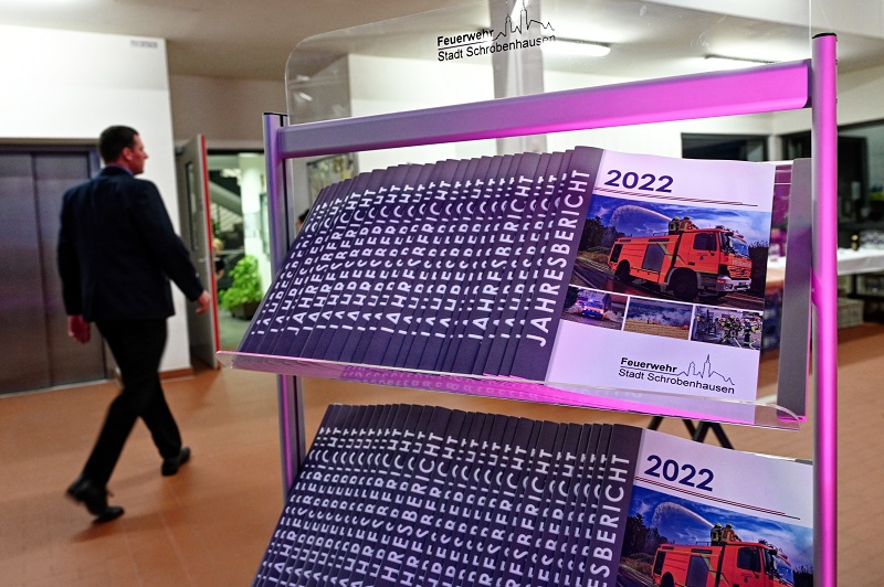 Schlingmann berichtete im weiteren Verlauf von ausgewählten Einsätzen aus dem Jahr 2022. Darunter verschiedene Brände, vom Zimmerbrand bis zum Großbrand, sowie von technischen Hilfeleistungen, von Türöffnungen, bis zu eingeklemmten Personen war wieder einmal alles dabei. Ein Großbrand in Klingsmoos, der sich bei hochsommerlichen Temperaturen über mehrere Gebäude ausbreitete, forderte u.a. die Stadtfeuerwehr stark. Besonders belastend war ein Einsatz mit Stichwort "Person unter Zug" mit tödlichem Ausgang. Ein ungewöhnlicher Einsatz war die Personenrettung von einem LKW über die Drehleiter. Der Fahrer hatte auf dem Dach des LKWs einen medizinischen Notfall erlitten und musste in einer Fahrzeughalle schonend vom Lastwagen heruntergebracht werden. Auffällig waren die sich wiederholt häufenden Flächenbrände im Wechsel mit Starkregenereignissen. Bei insgesamt 210 Einsätze wurden 1.961 Personen mit 2.696 Einsatzstunden eingesetzt.