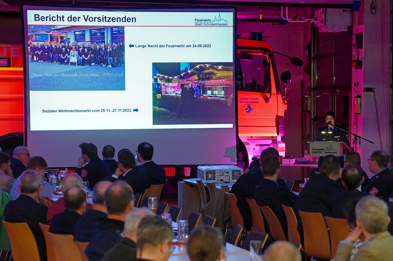 Stefanie Landshammer, 1. Vorsitzende der Stadtfeuerwehr, berichtete vom Vereinsleben der Wehr. Von zahlreichen Hochzeiten, über die Aufstellung des Maibaums bis zu den Fahrzeugweihen von drei Fahrzeugen und dem ersten öffentlichen Steckerfischgrillen war viel geboten. Ein besonderes Highlight war die Lange Nacht der Feuerwehr im September 2022. Hier waren ca. 50 aktive Feuerwehrler eingebunden, um die verschiedenen Vorführungen, Stationen und die Verpflegung zu übernehmen. Ein richtiger Besucheransturm belohnte die Aktiven für Ihre Arbeit. Der Stand auf dem sozialen Weihnachtsmarkt - ein MUSS für alle Feinschmecker, einem begehbaren Adventskalenderfenster sowie von einer ganz besonderen Weihnachtsfeier berichtete Landshammer weiter.