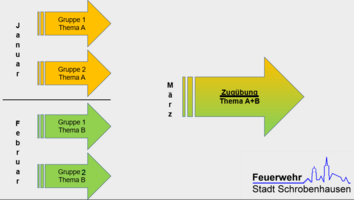 Die Mannschaft wird für die Übungen in zwei Gruppen geteilt und für jede dieser Gruppen steht dann im jeweiligen Monat das selbe Übungsthema an. Die  Themen werden von den Löschmeistern der Wehr ausgearbeitet und die Übungen vorbereitet. Dennoch besteht auch die Möglichkeit, bei einer Verhinderung, an der Übung der jeweils anderen Gruppe teilzunehmen.