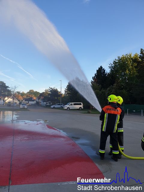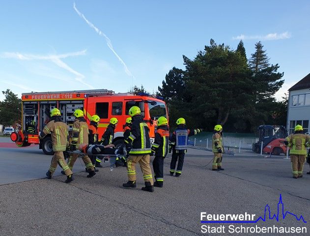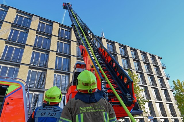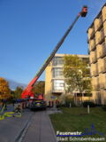 Auch die Rettung der 2 Verletzten vom Dach des ca. 25m hohen Bürogebäudes verlief reibungslos und brachte den Floriansjüngern einiges Lob von den zahlreichen Zuschauern ein.