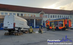Es galt, einen Kellerbrand auf einer Fläche von ca. 800m² zu bekämpfen, eine unter einem 3,5 Tonnen schweren Transporter eingeklemmte Person mittels Hebekissen zu befreien, 2 verletzte Personen vom Dach des 6-stöckigen Bürogebäudes mit der Drehleiter zu retten und eine lange Schlauchleitung aufzubauen.