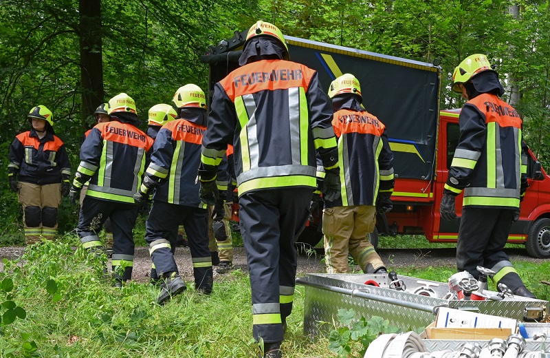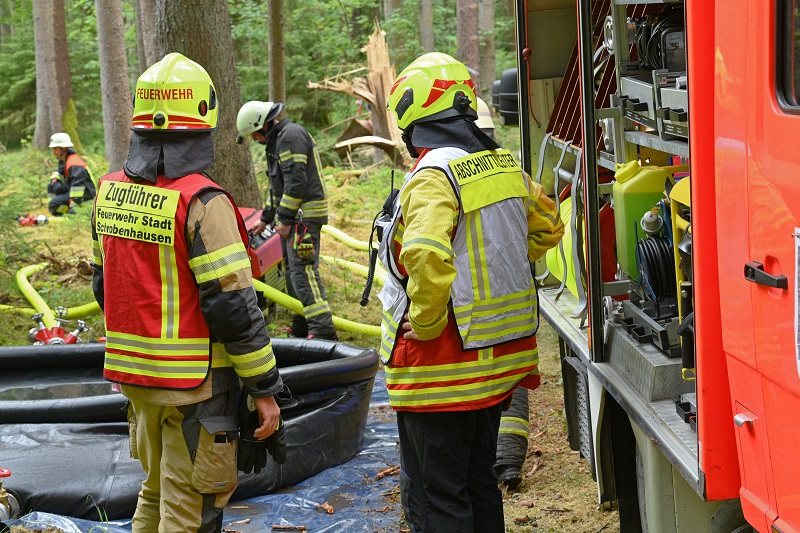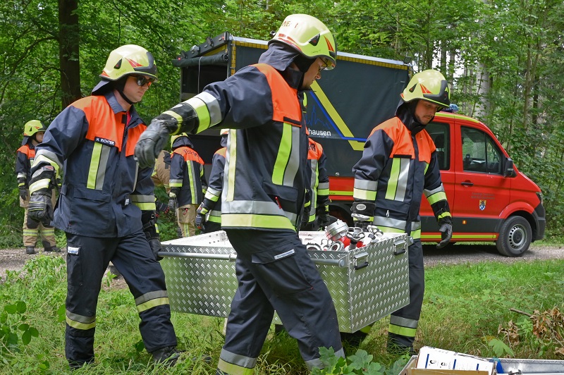 Aufgeteilt in zwei Brandabschnitte wurde von uns mit den Materialien aus dem Waldbrandmodul unterstützt. Gemeinsam mit der Freiwilligen Feuerwehr Sandizell wurde der 5000 Ltr. fassende Löschwasserbehälter aufgestellt und mittels drei Stichleitungen á zwei Strahlrohren der fiktive Brand bekämpft. Ebenfalls kamen die Löschrucksäcke, sowie weitere Geräte wie Feuerpatschen und dem Waldbrand-Werkzeug „Gorgui“ (Spezialhake zur Wald- und Vegetationsbrandbekämpfung) zum Einsatz.
