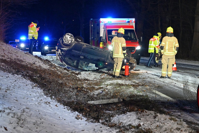 Aufgrund winterglatter Fahrbahn kam ein Pkw ins Schleudern und überschlug sich. Der Fahrzeugführer erlitt leichte Verletzungen und wurde vom Rettungsdienst versorgt. Die Feuerwehr sicherte die Unfallstelle ab.